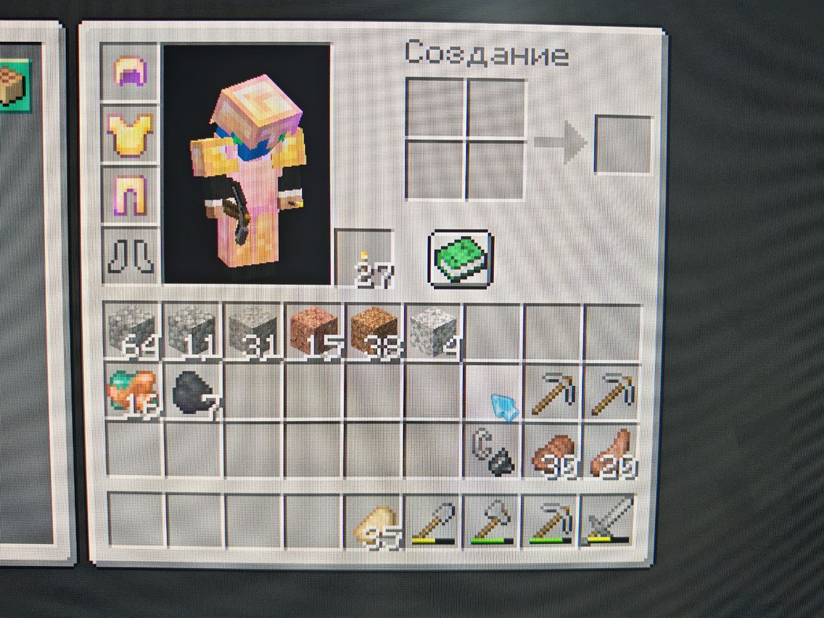 Для начала сделайте инвентарь, похожий на мой: все инструменты (меч, 1 кирка, топор, лопата обязательны) в правом углу, там же должнен быть какой нибудь хавчик: мясо, хлеб, золотая морковь, даа хоть сладкие ягоды. Слотом выше можете взять ещё хавчика или какой нибудь дополнительный инструмент. На картинке я взял ещё два вида мяса и зажигалку. А ещё слотом выше разместите побольше кирок. Чем больше ресурсов добываешь, чем больше кирок делай. Но куда же складировать добытые ресурсы? В левом верхнем углу размещай добытые БЛОКИ: андезит, диорит ересь и прочие граниты. Слотом ниже складируй РУДЫ: железо, медь, уголь, алмазы и т. Д. В левую руку советую взять факела, очень удобно! Левой кнопкой мыши сражаешься с мобами, или добываешь руды, а правой - освещаешь местность!