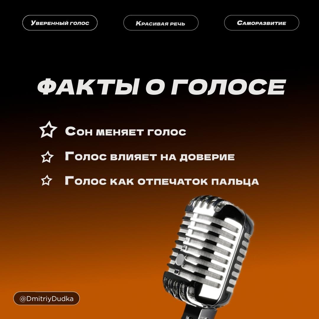 🎙 5 интересных фактов о голосе 💫Сон меняет голос: После бессонной ночи голос становится хриплым из-за снижения контроля над голосовыми связками. Так что лучше не ставить сон на последнее место в своей жизни 😅 💫Голос влияет на доверие: Люди с более низким голосом воспринимаются как более надёжные и компетентные. 💫 Голоса в голове — норма: 5–15% людей регулярно слышат "внутренние голоса" без психических отклонений. 💫Голос как отпечаток пальца: Вы наверняка слышали, что спектр голоса уникален для каждого человека. Это касается всех людей даже близнецов. 💫Дельфины "зовут" по имени: Дельфины используют уникальные свисты как "имена", различая их по голосу.