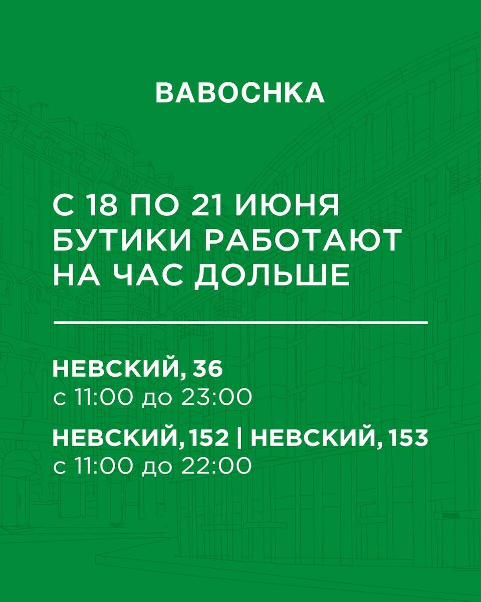Обновленный график работы с 18 по 21 июня в бутиках: BABOCHKA Невский, 36 BABOCHKA Невский, 152 BABOCHKA Невский, 153 Ждём вас в гости за желанными покупками!