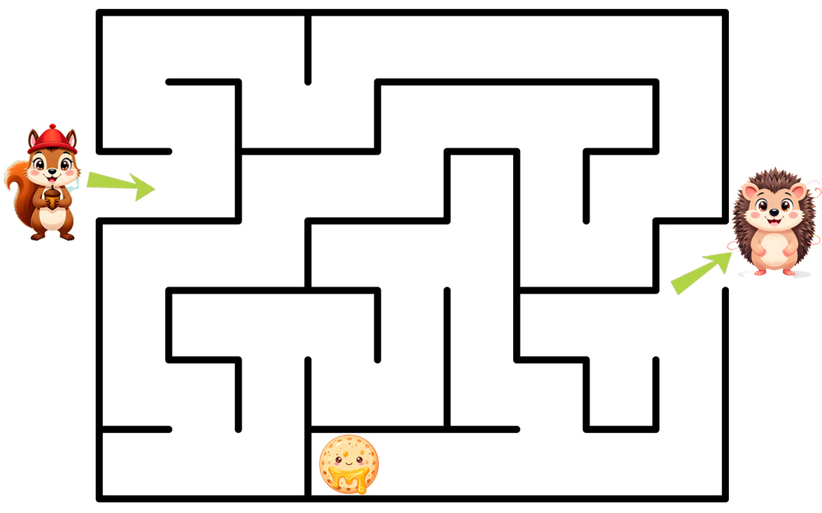Друг Бельчонка Ёжик простудился. Врач сказал Ёжику сидеть дома и запретил гулять на улице с друзьями. Ёжику очень скучно. Бельчонок решил порадовать своего друга угощеньем. ❗️Помоги Бельчонку добраться до дома Ёжика. По пути забери медовое печенье.❗ Больше лабиринтов можно найти в телеграм t.me/bestmaze