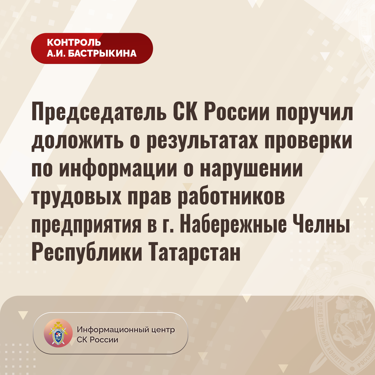 Председатель СК России поручил доложить о результатах проверки по информации о нарушении трудовых прав работников предприятия в г. Набережные Челны Республики Татарстан В телеграм-канале сообщается о нарушении трудовых прав сотрудников ООО «Адреналин Сервис», расположенного в городе Набережные Челны Республики Татарстан. На протяжении полугода более 30 граждан, осуществляющих трудовую деятельность в транспортной компании, не получают заработную плату. Многочисленные обращения к работодателю результатов не принесли. В СУ СК России по Республике Татарстан по данному факту начата процессуальная проверка. Председатель Следственного комитета Российской Федерации Александр Иванович Бастрыкин поручил руководителю СУ СК России по Республике Татарстан Валерию Андреевичу Липскому доложить о предварительных и окончательных результатах процессуальной проверки. Исполнение поручения, а также ход процессуальной проверки поставлены на контроль в центральном аппарате ведомства. #СледственныйКомитет #СК