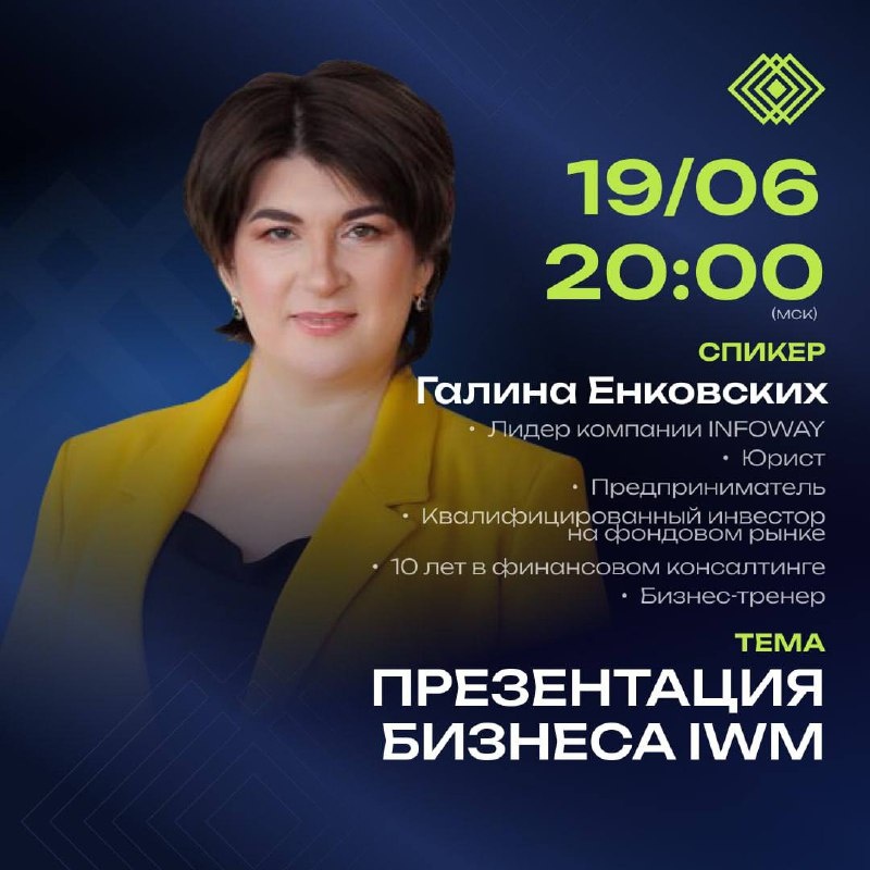 Для тех, кто хочет умножить доход и создать капитал! 🔥Завтра в 20:00 презентация бизнеса с Галиной Енковских! ЛИДЕР INFOWAY! - Успешный предприниматель - Профессиональный инвестор на фондовом рынке - Более 10 лет опыта в финансовом консалтинге Ждём всех! Ссылка: https://us06web.zoom.us/j/2116731674?pwd=xahqmhZLmGsNMAcfVYG8sNdiNWlLRY.1
