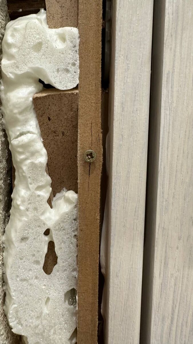 Когда наличник болтается в коробке🤔 🚪 Часто бывает такое, что когда устанавливаешь телескопический наличник в коробку, он, из-за того что клюв узкий, начинает бултыхаться в пазу. 🛠 Если ремонт у заказчика полностью готов, эту проблему можно решить: — приклеить наличник к стене — или подсунуть картонки в паз, чтобы распереть клюв Так получилось, что я устанавливал двери до поклейки обоев (заказчик сказал: «главное — двери, обои потом через 4–6 месяцев поклеим»). 📌 Приклеивать наличник к стене — не вариант, подсовывать картонки тоже (представляю лицо заказчика, когда он вытащит наличник, а оттуда посыплются эти картонки 😱) Так вот, решил я эту проблему следующим образом: 🔧 По периметру коробки, ближе к пазу, прикрутил саморезы 2,5×16 мм: — на стоевых — 5–7 штук — на верхних частях — 3–4 штуки В результате коробка немного расщеперилась, паз стал уже, а телескопический наличник заходит плотно — но без фанатизма, чтобы его киянкой не пришлось забивать 🛠 Пост взят с форума DOOR