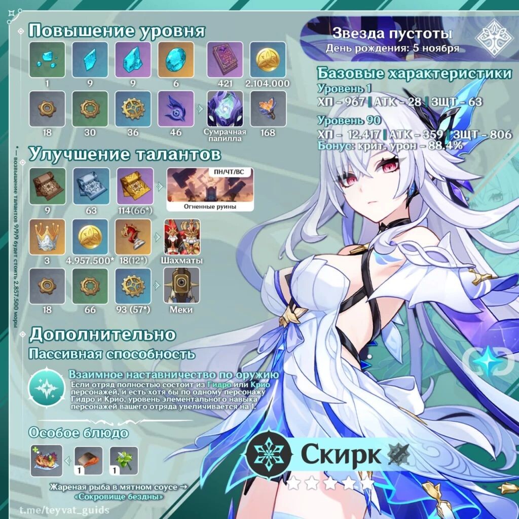 ㅤ❄ Стоит выделить второе созвездие, которое ускорит активацию обычного взрыва стихии и позволит меньше фокусироваться на показателе силы атаки при подборе артефактов. Четвёртое созвездие суммарно повысит силу атаки Скирк на 120% при игре в отрядах с только Крио и Гидро персонажами.