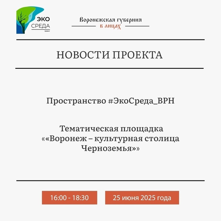 🏞 Воронежская губерния в лицах: культурное наследие столицы Черноземья 🌍💚 Друзья, приглашаем вас на встречу в пространстве #ЭкоСреда_ВРН Штаба общественной поддержки Воронежской области, которая пройдет в рамках проекта «Воронежская губерния в лицах. Истории, которые вдохновляют». 📅 Дата: 25 июня 2025 года 🕓 Время: 16:00 📍 Место проведения: Штаб общественной поддержки Воронежской области (https://vk.com/club220349174) пр-кт Революции, 35) 🎨🎶 Тематическая площадка «Воронеж – культурная столица Черноземья» посвящена культурному наследию нашего города. Погрузиться в атмосферу воронежской культуры и узнать больше о местных традициях, искусстве и ремёслах поможет координатор проекта #ЭкоСреда_ВРН Светлана Сафонова (https://vk.com/id55082373). В программе: - Настольная игра «Прогулка по Воронежу», где вы сможете проверить свои знания о городе. 🃏 - Музыкальная пауза «Воронеж. Родина. Любовь». 🎵❤ Мероприятие подходит для всех от 12 лет и старше. 👥✨ 🌟 Ждём вас на ЭкоСреде!