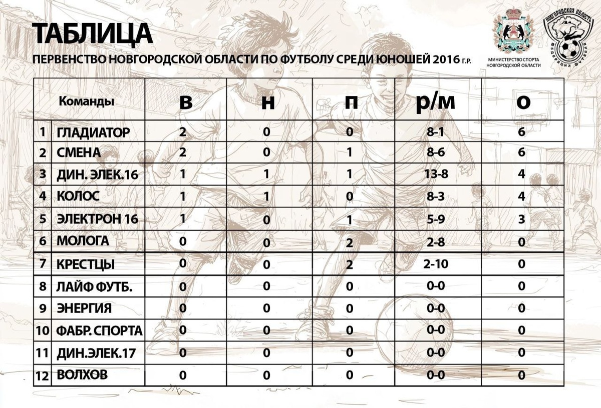 📊 Турнирная таблица первенства 🏆 Новгородской области по футболу ⚽️ среди 👦 юношей 2016 года рождения