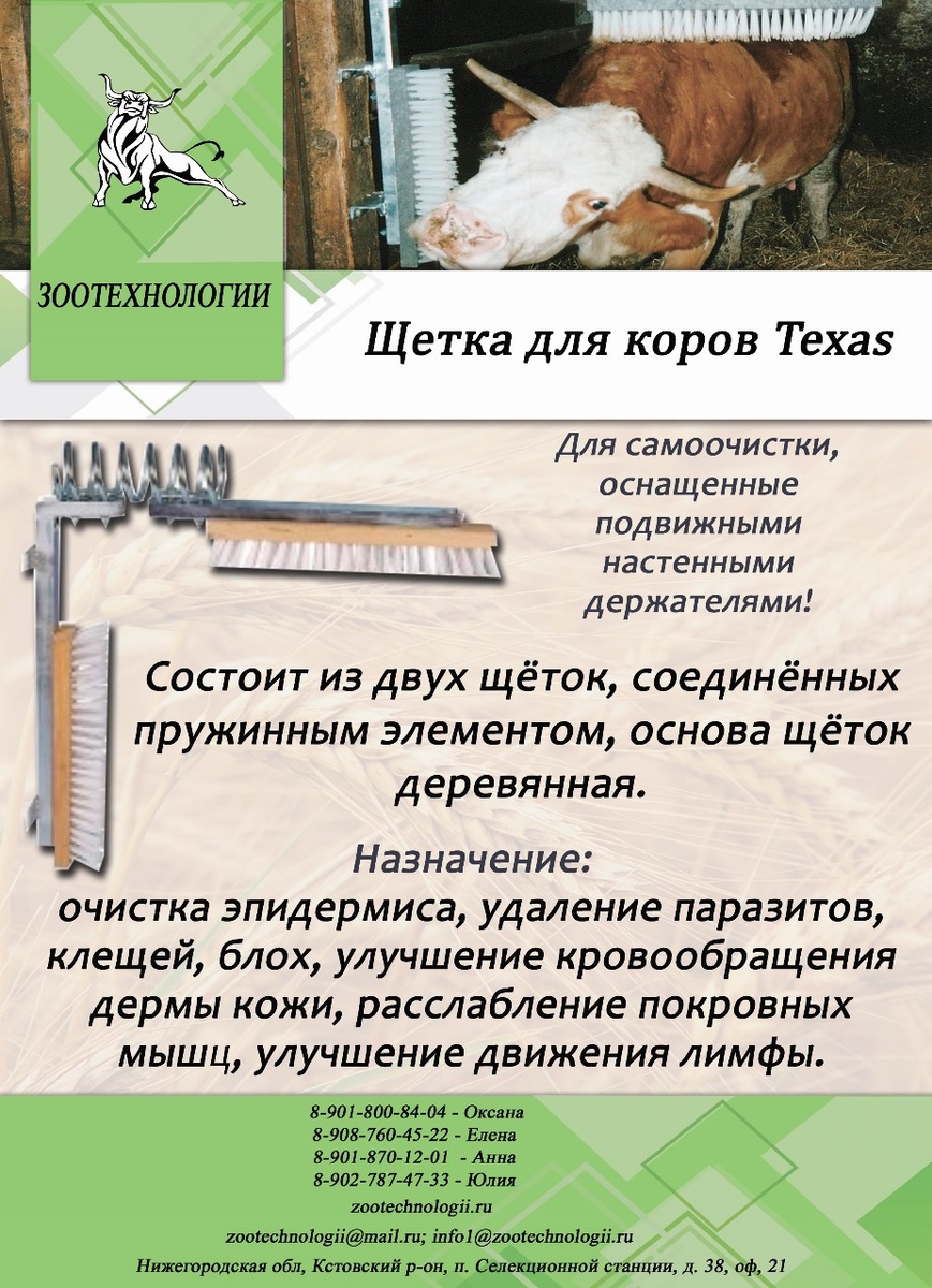 Добрый день. В продаже щетка для коров Texas, которая предназначена для ухода за животными. Она помогает: ✅Очищать тело коров, удалять паразитов, лишаи и клещей. ✅Стимулировать кровообращение у животных, что улучшает их самочувствие и здоровье. ✅Улучшать рефлекс молокоотдачи. Щетка имеет Г-образную форму с подвижными настенными держателями, размеры — 500×100 мм. В комплектацию входят вертикальный и горизонтальный элементы чесалки, а также монтажный комплект. Оставить заявку можно у наших менеджеров: Оксана: 8-901-800-84-04 Елена : 8-908-760-45-22 Анна: 8-901-870-12-01 Юлия: 8-902-787-47-33 Подписывайтесь на наше сообщество ВКонтакте✔️ #Щетка_чесалка #Коровы