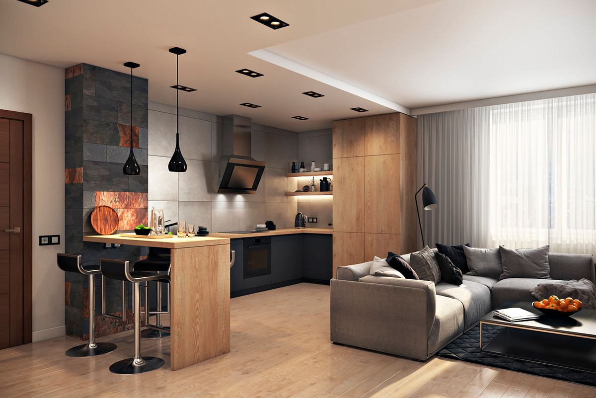 Разные напольные покрытия — ещё один эффективный способ. Плитка в кухонной части устойчива к влаге и легко моется, а ламинат или паркет в гостиной создают уют. Граница между материалами подчёркивает разделение зон.