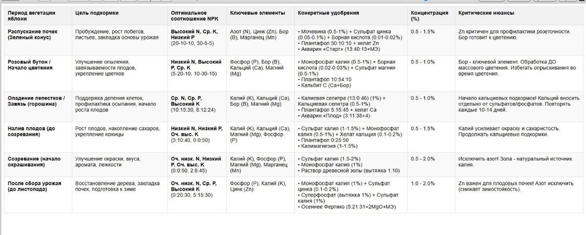 Хотел тут поговорить по листовым подкормкам. В общем смотрите... Хотя корни – главные "едоки" в мире растений, листовая подкормка – это мощный инструмент в руках садовода, позволяющий быстро и эффективно восполнить дефицит питательных веществ, поддержать растение в критические моменты и повысить общую урожайность и качество плодов. Понимание ее механизмов и правильное применение – ключ к здоровому и продуктивному саду. Вашему вниманию представляю подробнейшую таблицу листовых подкормок яблони с примерами препаратов по времени применения в этапы вегитации: