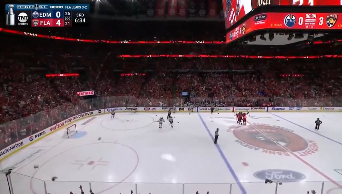 Празднования, по сути, начались после четвертой шайбы на 54-й минуте. Сэм Райнхарт сделал хет-трик – и на лед сразу полетели кепки.