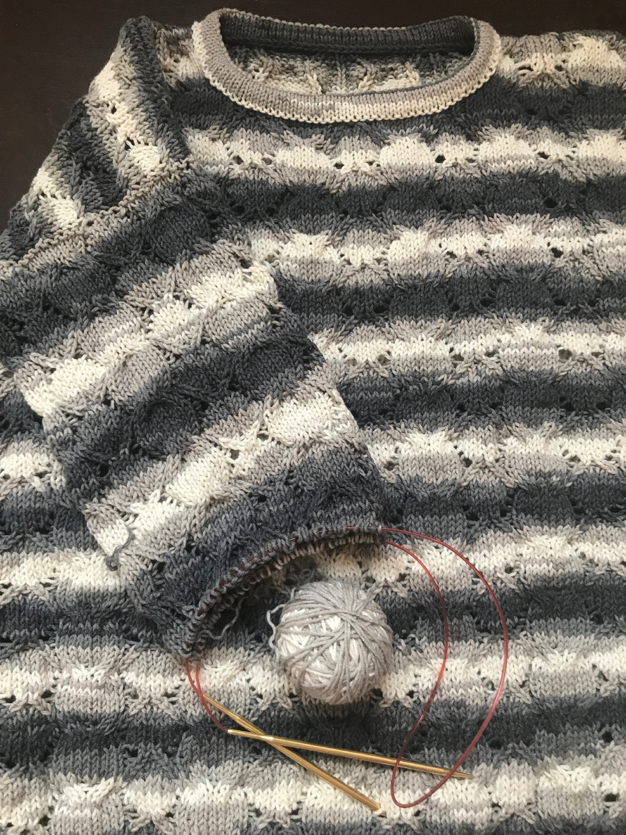 Прогулки прогулками, а джемпер «Всё в ажуре» сам себя не довяжет. 😄 Взялась за работу. Казалось бы, что там вязать в рукаве из проймы, сиди себе, перебирай петельки. Но что-то очень медленно у меня это получается. Отвлекаюсь постоянно то на одно, то на другое. Тем не менее, перевалила рукав через середину. 🤗 Параллельно замучила дочь примерками. 😂 Чуть провяжу, зову примерять. Вот оно и время: надели, сняли, поговорили. Рукав состоит из пяти рапортов узора в ширину. Это 65 петель. Порой мне кажется, что широковато получается. Особенно, если учесть, что перед и спинка связаны из семи рапортов. Но примерки говорят об обратном. Хорошо получается. 😍 Мне очень нравится, что в рукаве секции по ширине получается примерно такими же, как в полотнах переда и спинки. Если присматриваться, то видно, конечно, что в рукаве полосы шире, но в целом довольно гармонично смотрится. 😊 Обычно, когда я вяжу на себя, ширина полос пряжи секционного окрашивания в рукавах резонирует с основным полотно