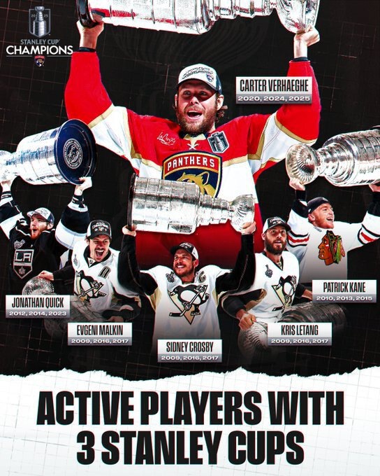Форвард дважды выиграл трофей с «Флоридой» (2024, 2025) и один раз с «Тампой» (2020). 29-летний канадец завершил плей-офф-2025 с 23 (7+16) очками в 23 играх при полезности «+12». Картер – 6-й действующий игрок (на данный момент), выигравший Кубок Стэнли трижды в карьере. В список также входят вратарь Джонатан Куик (2 Кубка Стэнли с «Лос-Анджелесом» и один с «Вегасом»), защитник Крис Летанг, форварды Сидни Кросби и Евгений Малкин (у всех 3 Кубка Стэнли с «Питтсбургом») и форвард «Чикаго» Патрик Кэйн (3 Кубка Стэнли с «Чикаго»). Напомним, что в этом году о завершении карьеры объявили вратарь Марк-Андре Флери (3 Кубка Стэнли с «Питтсбургом»), защитник Алек Мартинес (2 Кубка Стэнли с «Лос-Анджелесом» и один с «Вегасом») и форвард Патрик Марун (2 Кубка Стэнли с «Тампой» и один с «Сент-Луисом»). Официально о завершении карьеры не объявлял форвард Фил Кессел (2 Кубка Стэнли с «Питтсбургом» и один с «Вегасом»), но пропустил уже 2 полных сезона подряд. Сообщалось, что возобновить карьеру в НХЛ