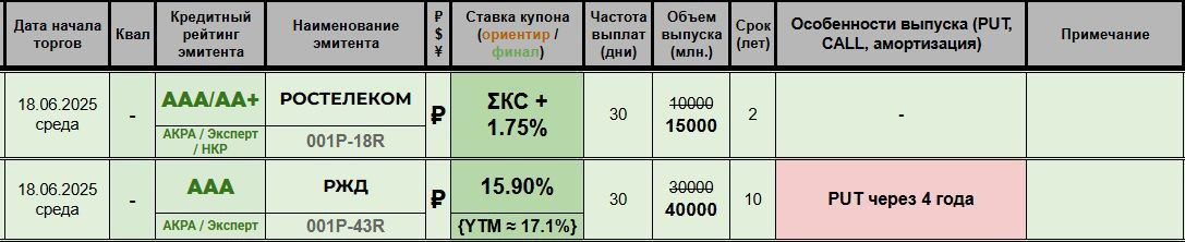 😉 Бодрый привет, дорогие читатели! Сегодняшние герои в особом представлении не нуждаются, значит, надолго мы с вами не задержимся :) ⬇️ Экстракты наивысшей надежности сегодня начнут торги: 〰️〰️〰️〰️〰️ 🟩 РОСТЕЛЕКОМ 001P-18R 📊 🅰️🅰️🅰️/🅰️🅰️➕ (АКРА / Эксперт / НКР) 🔹 $RU000A10BTC2 ▪️ Купон плавающий: ΣКС + 1,75% ✅ Без оферт ▪️ 2 года до погашения 〰️〰️〰️〰️〰️ 🟩 РЖД 001P-43R 📊 🅰️🅰️🅰️ (АКРА / Эксперт) 🔹 $RU000A10BTA6 ▪️ Купон фиксированный: 15,9% ⚠️ PUT: через 4 года ▪️ 10 лет до погашения ➤ В целом, сказать по компаниям абсолютно нечего. При всем прочем долгов хватает у обоих героев с головой, но ведь никто не верит в дефолт Ростелекома и РЖД? Наверное, если таковые случатся, брокерское приложение можно закрывать и идти на вклады. В ВДО хотя бы повышенной купонной доходностью за риски платят, но сон, конечно, становится куда более чутким 😃 〰️〰️〰️〰️〰️ 😉 Профессиональный серийный заемщик сегодня вновь пришел на первичку: 🟩 ПОЛИПЛАСТ П02-БО-06 📊 🅰️➖ (НКР) ⚠️ Долларовый выпуск с