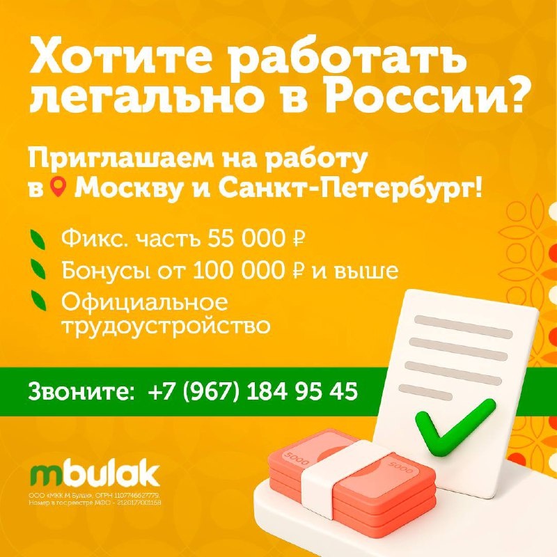 📢✅ Хотите работать легально в России и хорошо зарабатывать? 📍Приглашаем на работу в Москву и Санкт-Петербург! 💼 Фикс. часть 55 000 ₽ 💸 Бонусы от 100 000 ₽ и выше 📱Доплата за проезд и мобильную связь 📚 Обучаем с нуля - опыт не обязателен 📆 Гибкий график - не нужно сидеть в офисе ✅ Официальное трудоустройство - заключаем трудовой договор по законодательству РФ 🏆 Поощрение лучших - ежегодные слеты в крутых местах за рубежом! Работа в стабильной компании с достойными условиями. 📲 Подробности по номеру: +7 967 184-95-45