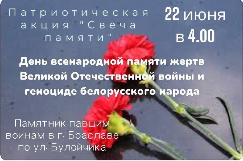 ⚡️В память о трагических событиях Великой Отечественной войны 22 июня в 4.00 на памятнике павшим воинам в г. Браславе по ул. Булойчика состоится патриотическая акция "Свеча памяти". В католических и православных храмах Браславского района 22 июня пройдут молебны в знак памяти погибших в годы Великой Отечественной войны.