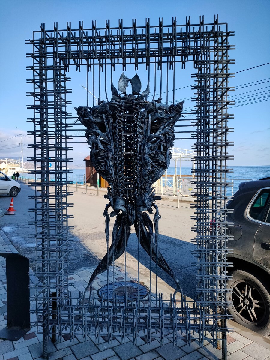 Южный тотем. Алушта🗿 Автор Д. Жуков. Жесткая структура рамы символизирует современное технологическое общество. А биологическая форма - рост как процесс Мне он напоминает фильм Чужие . #путешествияблондинки
