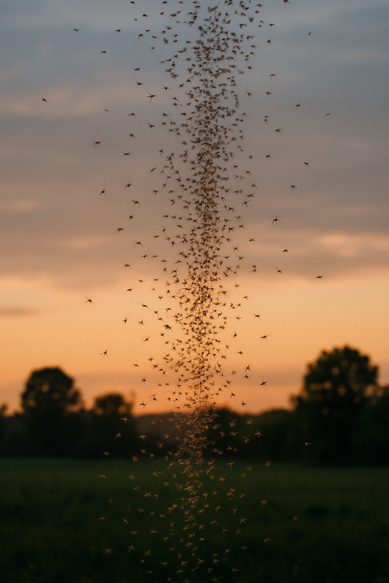Теплый летний вечер, закатное солнце окрашивает небо в мягкие тона... и в неподвижном воздухе вдруг появляются причудливые, живые, пульсирующие "столбы" из роящихся мошек и комаров. "Комары толкутся – к вёдру (к ясной погоде)", – говорили наши предки. Мы часто с раздражением отмахиваемся от этих назойливых насекомых, не замечая, что они, сами того не ведая, являются точными природными синоптиками. Так почему же этот вечерний "танец" насекомых почти безошибочно предвещает хороший, ясный день? Прежде всего, стоит понять, что мы наблюдаем. Этот "столб" или "толчея" – это на самом деле брачный рой. Чаще всего он состоит из самцов комаров-звонцов (которые, к счастью, не кусаются) или других мелких мошек. Они собираются в стаю над каким-то ориентиром на земле – пнем, кустом, светлым пятном на дороге – и своим синхронным полетом вверх-вниз привлекают самок для продолжения рода. Это очень энергозатратный и деликатный процесс, для которого нужны практически идеальные условия. И именно в этих у