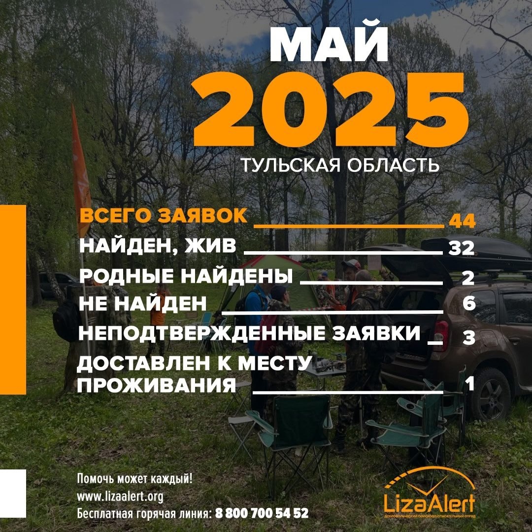 Статистика отряда #ЛизаАлерт Тульской области за май 2025 года. В мае к нам поступило 44 заявки. Из них: Найден, жив - 32 Родные найдены - 2 Не найден - 6 Неподтверждённые заявки - 3 Доставлен к месту проживания - 1 Присоединиться к активным поискам вы можете, заполнив анкету: vk.cc/c3O5xA, подписавшись на смс-рассылку lizaalert.beeline.ru/ или позвонив по номеру бесплатной круглосуточной горячей линии 88007005452 Будь с нами! #ЛизаАлерт #Май #Статистика #БудьСНами #Тула #ТульскаяОбласть
