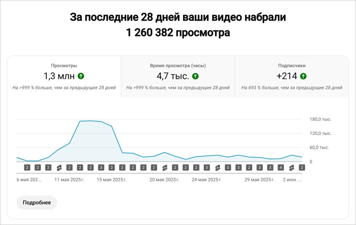 Май прошёл, а я даже не успел вам похвастаться, что собрал 1млн.+ просмотров на канале своего цифрового аватара💪 Цифры:
