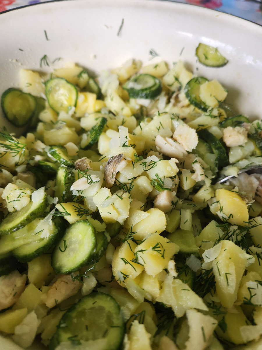 Добрый день, мои дорогие читатели. Поделюсь с вами рецептом салата очень вкусного и по-настоящему летнего. Ведь сейчас начинается самая благодатная пора. Начинают плодоносить овощи, огурцы и картошка. Они еще не приелись и каждый огурчик радует. Это не август, когда огурцы тазами и уже не знаешь куда девать. Задумайтесь о скоротечности времени: от первого огурца, который делим на всю семью до "куда их столько" проходит всего один месяц! И этот салат хорош именнно из первых своих овощей. Начнем с репчатого лука. Луковицу мелко режем, хотя можно и тонкими полукольцами, обдаем кипятком. Нарежем тонкими колечками несколько малосольных огурчиков. У меня три небольших. Отварную в мундире молодую картошку чистим, режем мелким кубиком. Добавляем 150 граммов отварной или запеченой белой рыбы. У меня хек. На крайней случай можно положить лосось из банки, только жидкость слить. Немного укропа, ароматного подсолнечного масла. Пробуем, возможно придётся добавить еще немного соли. Даем пост