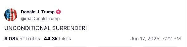 В ответ на пост Трамп дал Ирану 24 часа на капитуляцию. Президент США Дональд Трамп потребовал, чтобы Иран в течение суток прекратил все ядерные программы и сдался, призвав верховного лидера Аятоллу к «безоговорочной капитуляции». В случае отказа он пригрозил ликвидацией иранского лидера, заявив, что Израиль уже готов к действиям. По данным источников, США рассматривают возможность вступления в конфликт, но окончательное решение пока не принято. В ответ Тегеран пригрозил атаковать американские военные базы на Ближнем Востоке. Подписывайтесь на Инфо24 | Прислать новость