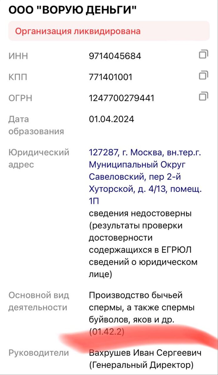 🧬 В России ликвидировано юрлицо с названием ООО «Ворую Деньги». Зарегистрировано было 1 апреля 2024 года. Указанный вид деятельности — производство бычьей спермы. Ну, ещё жеребцов, ослов и хряков, если уж быть точным. Учредитель и директор — некий Вахрушев Иван Сергеевич. Уставной капитал — 1 триллион рублей. Цифра, конечно, символичная. В январе 2025 компания официально начала процесс ликвидации. ❌ Название, деятельность, капитал — всё в этом кейсе будто кричит: "Проверка на внимательность у налоговой". Но она, судя по всему, не сдала. https://dzen.ru/id/65d0bd2d3933641137a41b90 #воруюденьги #оформимнахряка #госрегистрация #налоговая #спермакапитализма #циничныефинансы