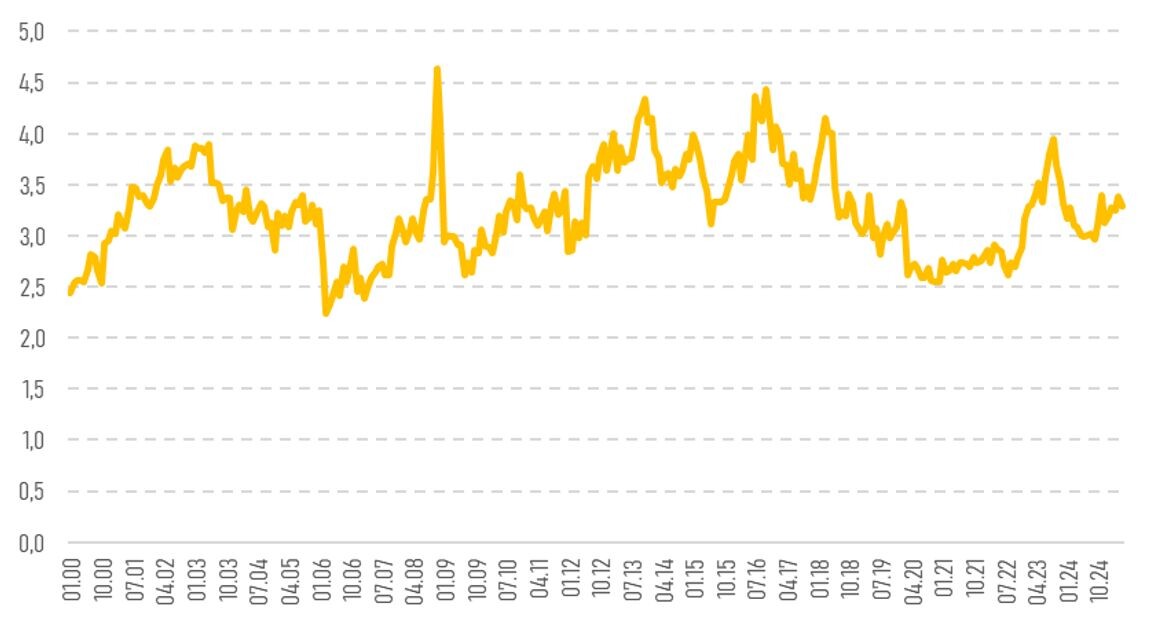 Индикативные ставки денежного рынка выросли на фоне повышения волатильности на валютном рынке. Доходность TONIA увеличилась с 15,62% до 15,67%, тогда как ставка SWAP-1D поднялась с 10,62% до 10,68%. Общий объём торгов составил 552 млрд тенге (+33 млрд тенге по сравнению с предыдущим днём). В то же время спрос на депозитном аукционе НБРК снизился до 1,2 трлн тенге (-406 млрд) и был удовлетворён на 100% по ставке 16,5% годовых. Открытая позиция НБРК сохранилась на уровне 8,0 трлн тенге.