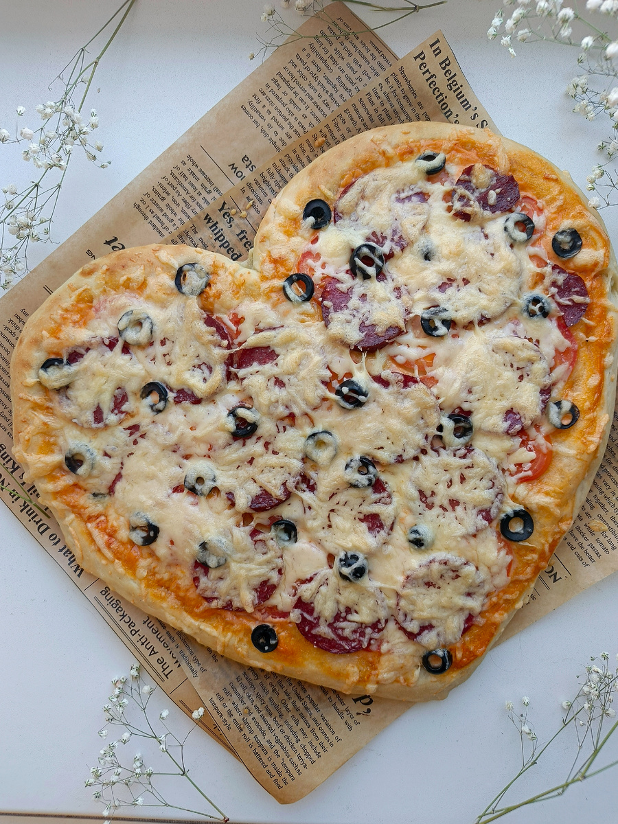Как вам моя "валентинка", подаренная самой себе? 😅 Начинку можно использовать любую😊 Кстати, размер пиццы на видео получился не очень понятным. На самом деле, если ее скруглить, то диаметр будет почти полметра😂 Ну, сантиметров 40 Ингредиенты: ☘️мука - 300-320 г; ☘️вода - 220 мл; ☘️растительное масло - 8 стл.; ☘️дрожжи сухие - 1 ст.л.; ☘️сахар - 1 ст. л.; ☘️соль - 1 ч. л. Ингредиенты для начинки: ☘️колбаса сырокопчёная; ☘️сыр; ☘️маслины; ☘️помидоры; ☘️кетчуп+майонез. Приготовление 1. В теплой воде растворить дрожжи, сахар и несколько столовых ложек муки. Перемешать и оставить на 15-20 минут. 2. Добавить соль и растительное масло. 3. Всыпать муку. Вымесить тесто и оставить его в тепле под полотенцем на час. 4. Распределить тесто тонким слоем по пергаменту или смазанной форме. 5. Смазать кетчупом, перемешанным с майонезом. Выложить нарезанные помидоры, колбасу и маслины. 6. Выпекать при 190 градусах минут 10. 7. Посыпать тертым сыром и выпекать еще минут 15.