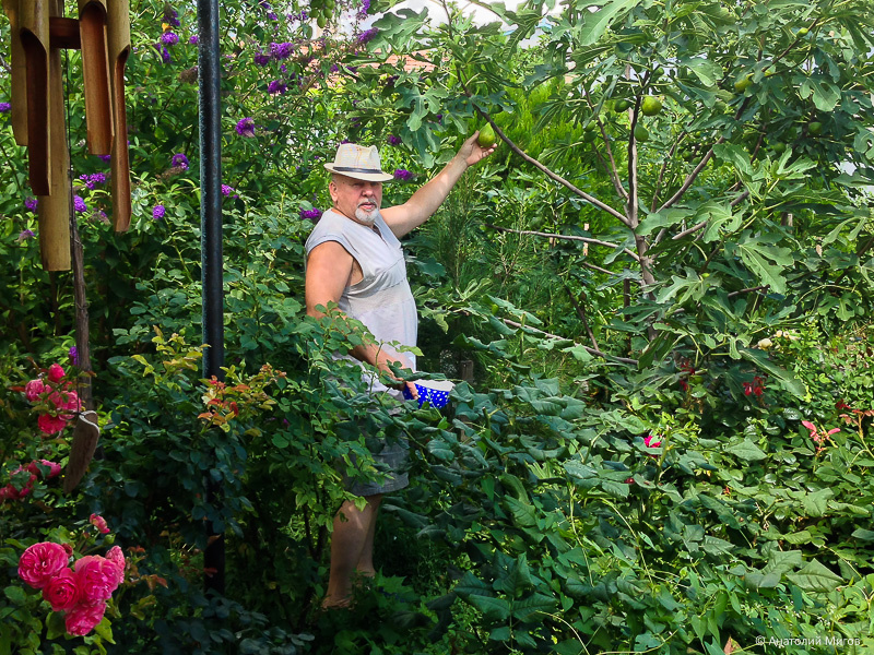 Впрочем, в Крыму всё растет стремительно, так что время пролетит незаметно. На фотографии, которую я поставил заглавной, 13 июля 2019 года. Лена поймала меня в момент сбора инжира. Как видите, стою в окружении деревьев и цветов, всё растёт, цветёт, зреет и благоухает. А нашему саду в этот момент всего три года.