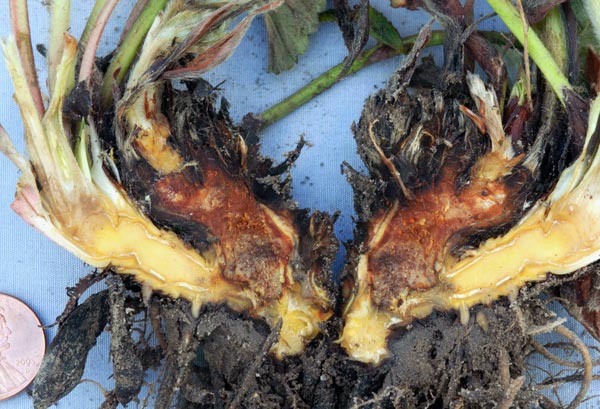 Первые признаки корневой гнили проявляются на корневой системе клубники в виде небольших черных пятен. Со временем эти пятна увеличиваются в размерах и сливаются, поражая всю корневую систему. Корни становятся сухими и ломкими.