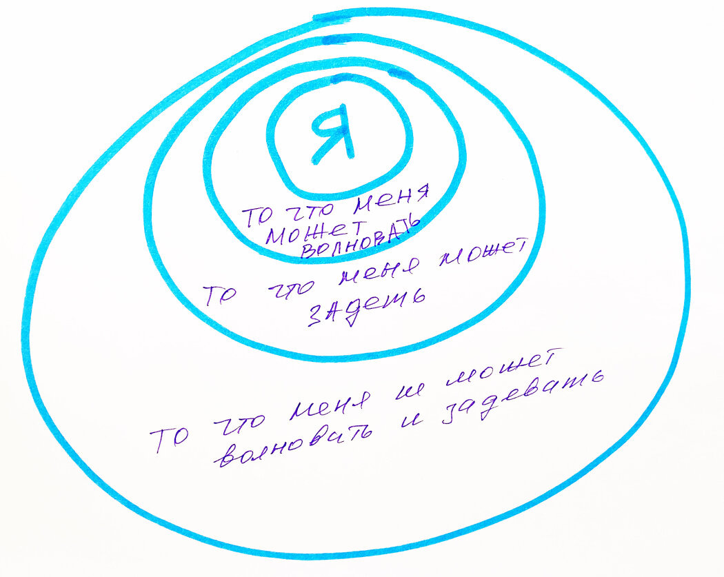 Об эмоциях можно писать толстые книги, с множеством томов посвящённых каждому чувству, страху, зависти, разочарованию…… Но вот что самое важное можно сказать об эмоциях, это про их адекватность (( в психиатрии это про способность тестировать реальность.. эмоции хорошо помогают нам определить , что на самом деле мы думаем и во что на самом деле верим.. то есть какие в голове мысли У меня на днях родилась хорошая идея, представить теорию эмоций в виде вот таких кругов. И создать из этого упражнение. Назвать это упражнение можно - круги эмоциональной адекватности. В центре Я 1 круг - это то, что меня может волновать 2 круг - то , что меня может чуть задеть 3 круг - то, что меня не может ни волновать, ни задевать, к чем я остаюсь совершенно равнодушен. Так можно определить силу своей вовлеченности в события, и поставить себе осознанные границы на эмоциональные реакции. ПС: рисунок конечно так себе, но мой перфекционист ушел в отпуск :)) Суть в том, что нас не должно выводить из эмоциональн