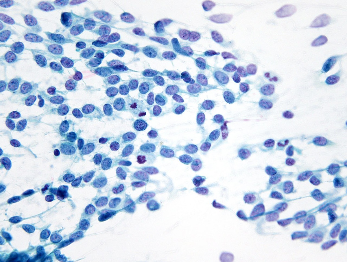 Синовиальная саркома в материалах ТАБ представлена скудной монотонной цитоморфологией. Высокая митотическая активность (как здесь) является отличной подсказкой. На практике для подтверждения прибегают, также, к ИГХ и FISH. Материал ТАБ образования в мягких тканях брюшной стенки. Объектив 100x. #синовий #цитология #саркома