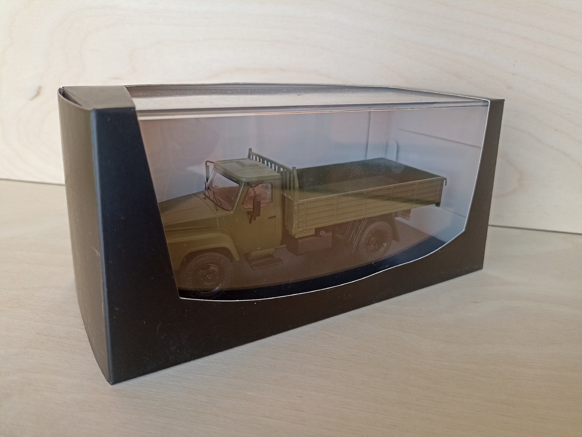 В конце 2024 года от коллег-моделистов я получил занятный подарок. Это была модель китайского грузового автомобиля Dongfeng EQ140. Этот грузовик представляет собой китайскую вариацию ЗИЛ-130. Помимо оригинального прототипа меня позабавило сходство этой модели с моделями от ССМ, но обо всём по порядку. Начнём с упаковки. Модель поставляется в прозрачном боксе, который, в свою очередь, упакован в картонную коробку с большим окном. Формы бокса, подиума и коробки полностью повторяют аналогичные от ССМ. Даже картон коробки на ощупь имеет ту же плотность, что и костромской аналог. Коробка черного цвета, на обратной стороне изображена стилизованная кабина грузовика. На дне коробки имеется продублированное на нескольких языках предупреждение о том, что это не игрушка, а коллекционная модель, и, стало быть, лиц младше 14 лет подпускать к ней нельзя. Также на дне указан производитель модели - Mission Model. Подиум такой как у моделей ССМ, но без соответствующего логотипа. К нему снизу скотчем пр