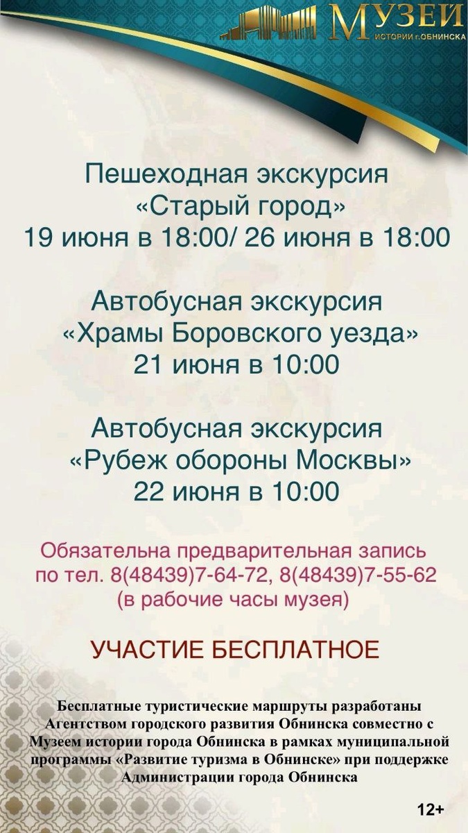 ❗РАСПИСАНИЕ БЕСПЛАТНЫХ ЭКСКУРСИЙ В ИЮНЕ❗ ⌚Расписание экскурсий ❗19 и 26 июня в 18:00 пешеходная экскурсия "Старый город". Сбор групп в сквере им. С.А. Кудрявцевой (пл. Бондаренко). ❗21 июня в 10:00 автобусная экскурсия «Храмы Боровского уезда». Сбор групп у Музея истории г. Обнинска (пр-т. Ленина, д.128). ❗22 июня в 10:00 автобусная экскурсия "Рубеж обороны Москвы". Сбор групп у Музея истории г. Обнинска (пр-т. Ленина, д.128). ☎Обязательна предварительная запись по т. 8(48439)7-55-62 и 8(48439)7-64-72 (в рабочие часы). *Количество мест ограничено. Просьба наличие мест уточнять по телефону. 👍 Подписаться | Прислать мероприятие