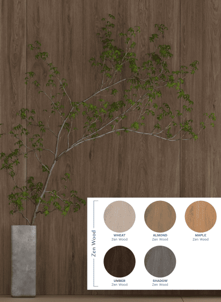- Цветовая гамма коллекции Zen Wood, представленная в формате 1200х3000 мм и толщине 3,5 мм, включает 5 оттенков с 3 различными вариантами рисунка для каждого цвета.