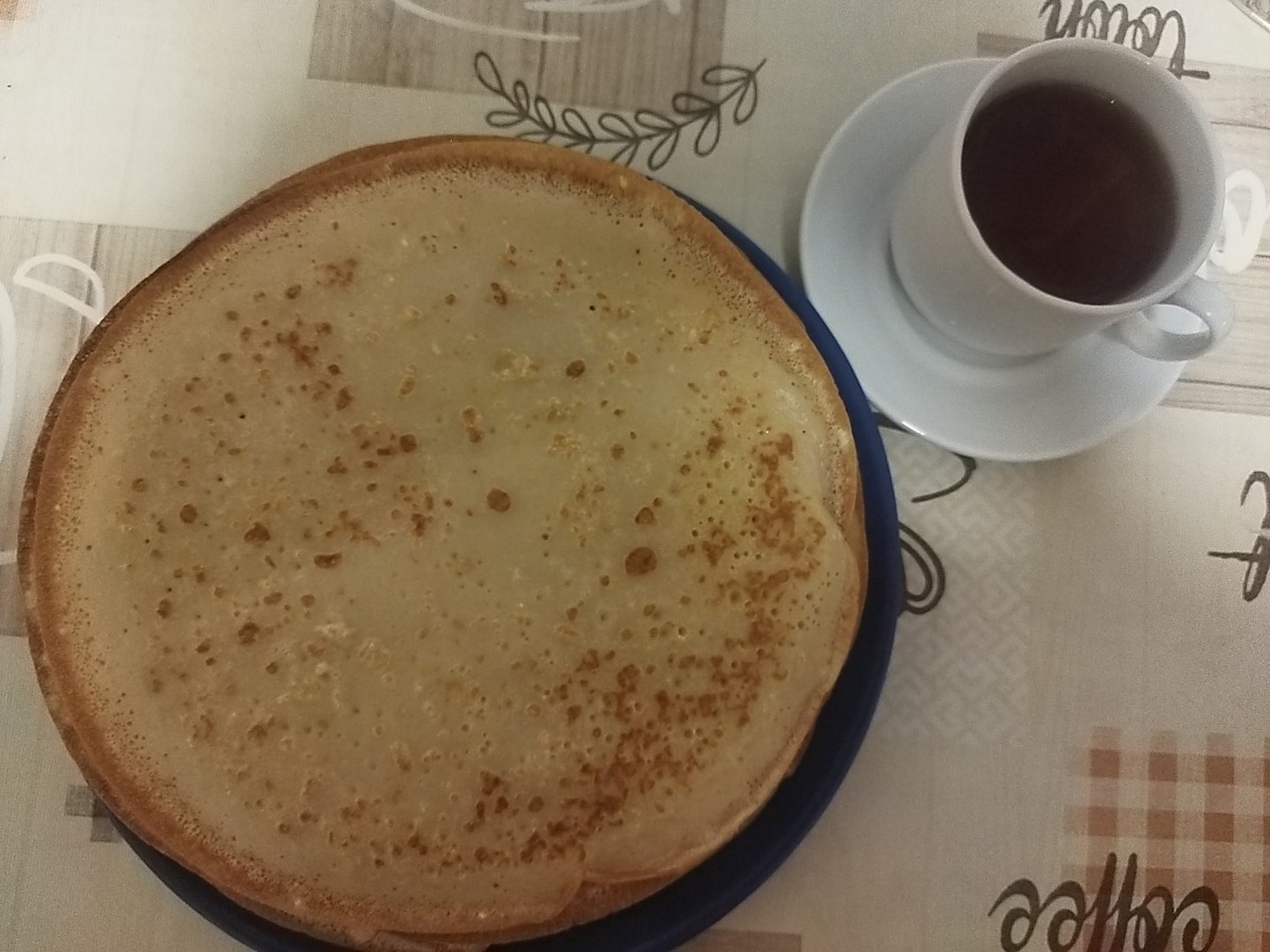 В семье моих родителей существует традиция: "Если дома закончился хлеб или его вечером забыли купить, значит печем блинчики или оладушки". Молоко или простокваша в холодильнике всегда были. С детства люблю замешивать и печь блинчики. Состав: Мука - 2 стакана, Сахар - 3 ст. ложки, Соль - 0,5 ч. ложки, Сода - 0,5 ч. ложки, Подсолнечное масло - 3 ст. ложки, Яйцо- 1 шт., Молоко - 2,5 стакана. Вместо молока, иногда использую простоквашу 1,5 стакана и 1 стакан горячей воды или полностью заменяю на воду и кипяток. Единственное если тесто замешивать на воде, то необходимо добавить 1 ст. ложку картофельного или кукурузного крахмала. Рассказываю, как я готовлю блинчики. Если с кипятком, то стакан кипятка наливаю в самом конце. Зажигаю огонь на плите, наливаю немного подсолнечного масла, на сковороду, чтобы тонким слоем размазать кисточкой и перемешиваю тесто небольшим половником. И начинается самый важный процесс выпекания блинчиков. Вот сковорода нагрелась. Наливаю тесто на сков