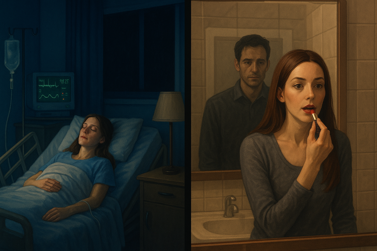 Она была не собой — молодой женщиной лет тридцати, с длинными каштановыми волосами. Стояла у зеркала в ванной комнате и наносила красную помаду. В отражении виднелся мужчина — высокий, темноволосый, с усталым лицом.