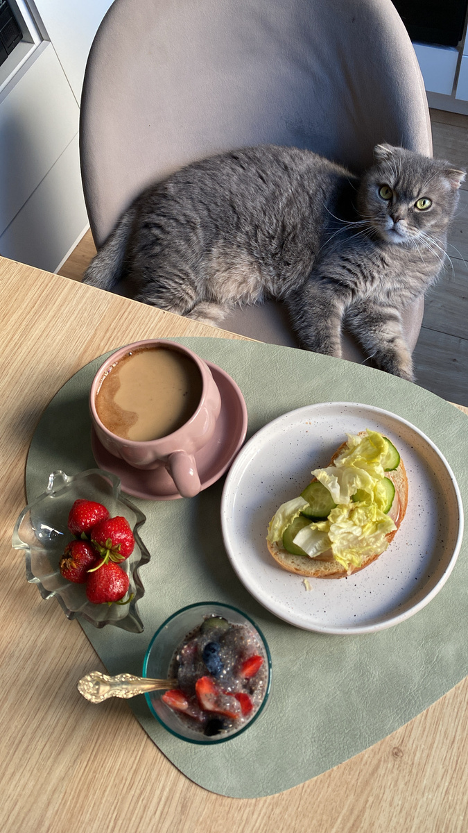 Мой идеальный завтрак (и кот) Если утром нет завтрака — день как будто не начинается. А если он не просто есть, а вкусный, красивый и с кофе из турки — значит, всё будет хорошо. ⠀ Мой день всегда начинается с тишины и кухни. Я ещё не разговариваю, не листаю телефон, не думаю про дела — я ставлю турку на плиту. Кофе варю только так. Медленно, с пенкой. Этот ритуал не меняется уже много лет. И если вдруг дома заканчиваются зёрна — я иду покупать. Потому что утро без кофе из турки — не утро. ⠀ Пока он варится, достаю из холодильника стакан с чиа. Вечером заливаю их кокосовым молоком. Утром просто добавляю сверху — ягоды. Голубика и клубника — самые любимые. Это сладкое, но не приторное. Лёгкое, но питательное. И красиво же, как десерт из кафе. ⠀ Параллельно жарю хлеб. Один ломтик — хрустящий тост. Добавляю на него тонкий ломтик ветчины, свежий огурец и салат. Идеально. Иногда посыпаю сверху семечками или сбрызгиваю оливковым маслом — по настроению. Но даже без всего этого это тост, к кот