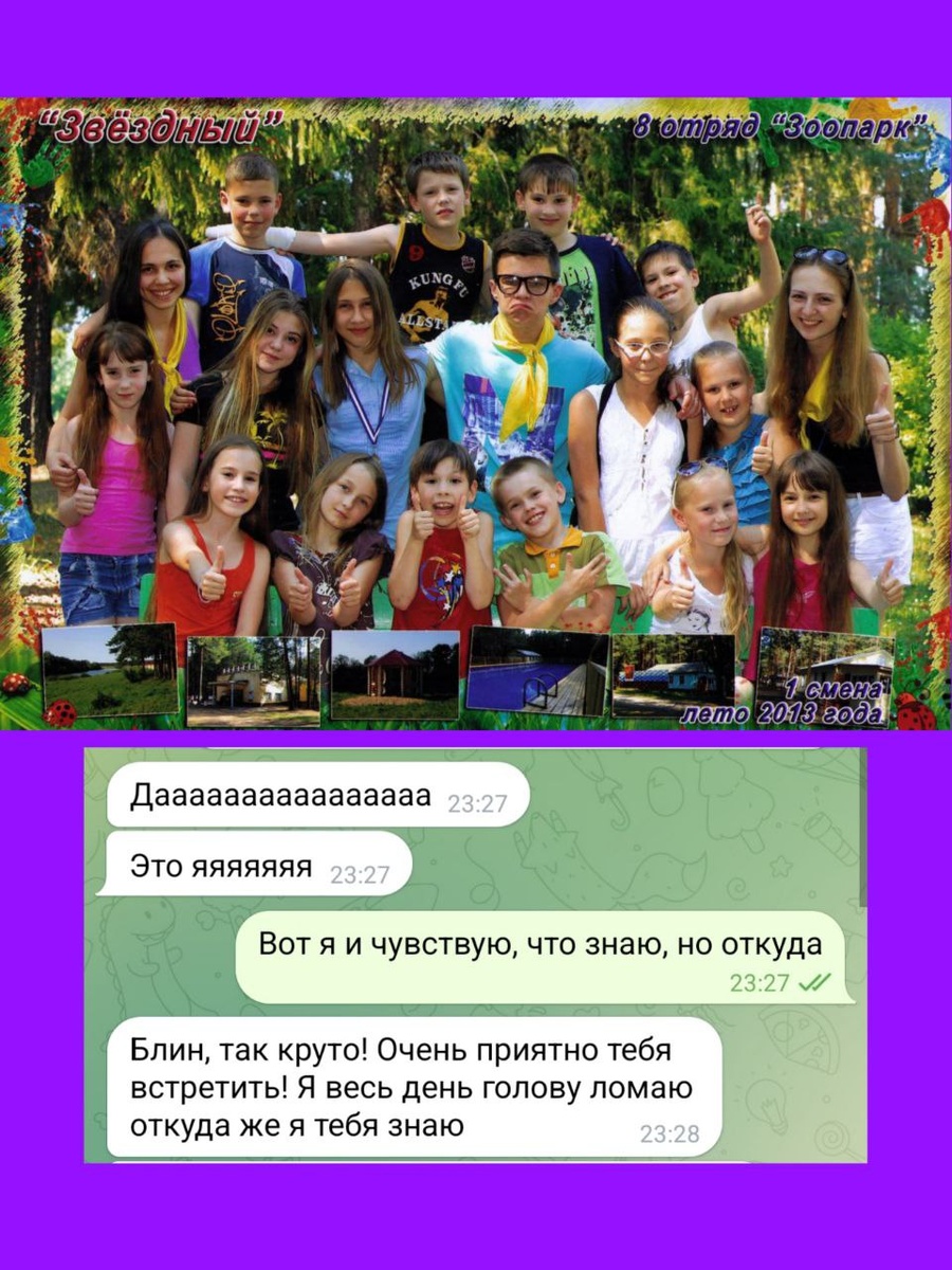 Знаете чувство, когда видишь человека, понимаешь, что где-то его точно видел, но никак не можешь вспомнить, где?! 🤷♀ У меня такое произошло в интерактиве от любимого психолога, где можно было презентовать себя и познакомиться с классным окружением. Многие, я вижу, присоединились как раз от Виктории 🩷 когда-то я получила подарок, созданный ей специально с издательством - посмотрите, вам понравится! 👉 Так вот, я написала о себе и в поиске начала искать людей из своего города. Одна девушка показалась мне очень знакомой, и я об этом прямо написала. К моему удивлению, она тоже ломала голову весь день, откуда же она меня знает. Задав друг другу несколько вопросов, мы выяснили, что были в одной смене в лагере в 2013 году! Только я была вожатой, а она моей воспитанницей! 🫶 ➖Вот так летит время и ребята, которых мы обучали и воспитывали, уже серьёзные люди, которые работают и живут своей собственной жизнью. А ведь ещё недавно мы пели отрядные песни, играли в зарницу и зажигали на диско