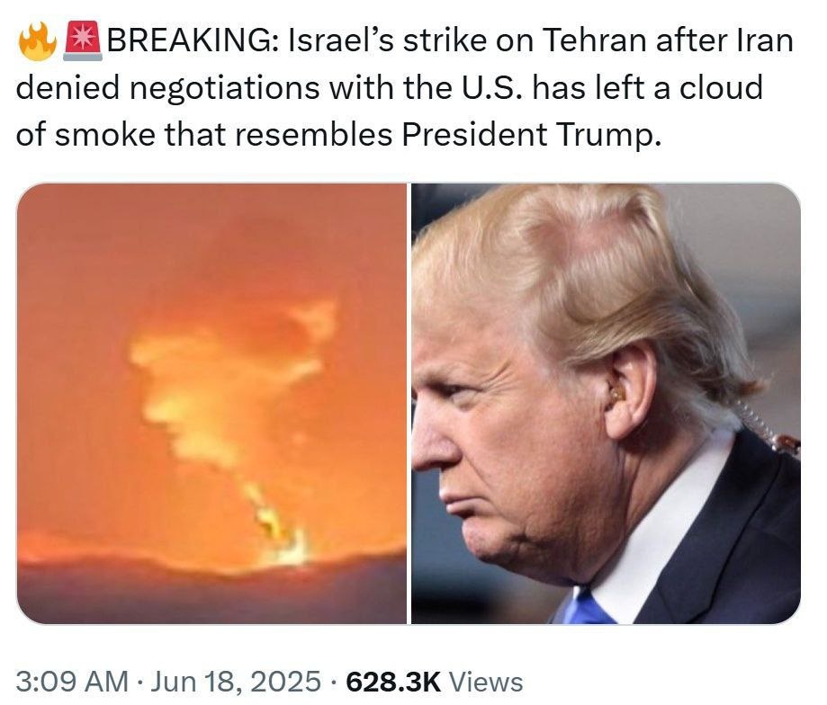Израиль нанес удар по Тегерану после отказа Ирана от продолжения переговоров с США и облако взрыва напоминает профиль Дональда Трампа