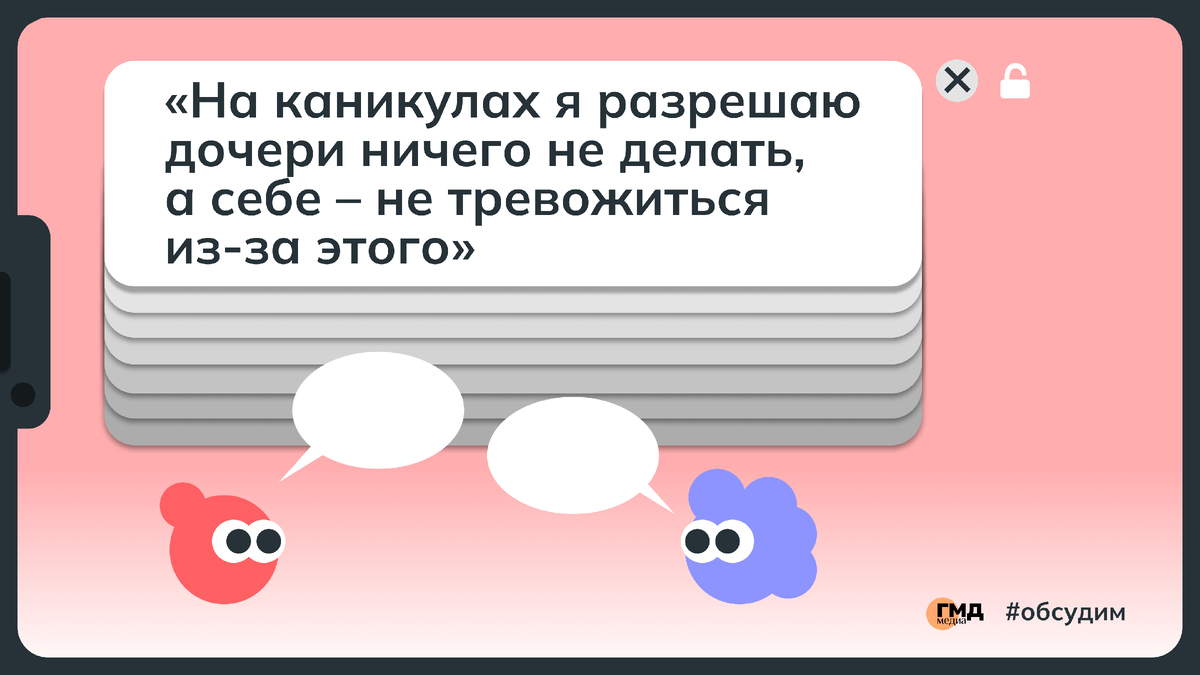 Сегодня мы публикуем письмо нашей постоянной читательницы. Мама 10-летней дочки в своём письме делится подходом к летнему отдыху. Это рубрика #обсудим. Спасибо, что доверяете нам свои истории. Если вы хотите поделиться опытом, рассказать о чём-то важном или просто высказаться, пишите на pr@gmd.live — мы читаем все ваши письма. Моей дочке 10 лет, и во время летних каникул она просто отдыхает! Мы отменяем все кружки и секции. Я не заставляю её читать книжки из списка для внеклассного чтения, разрешаю ей спать до обеда, есть сладкое, играть в приставку, гулять, а ещё я не ограничиваю ей экранное время. Вместо этого она читает те комиксы и те книги, которая сама выберет — для этого в конце мая мы зашли в книжный магазин, где она сама выбрала 5 книжек с самыми яркими красивыми обложками и впридачу взяла 3 дорогущих комикса. А ещё она сама выбрала лагерь, в который поедет в конце лета. И это не какой-то новомодный лагерь с умными развивашками, и не лагерь с углублённым английским, куда часто