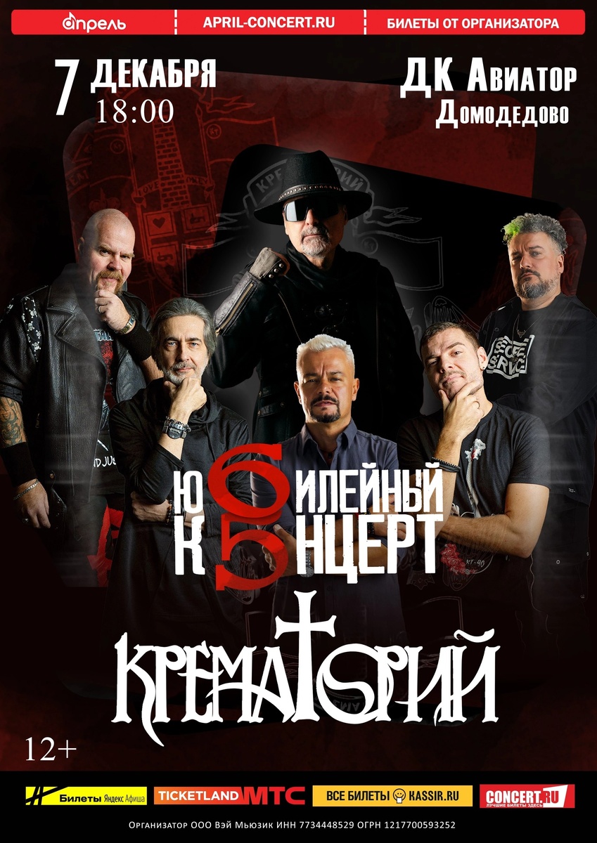 ✨ Приглашаем на концерт!!! От Московского андерграунда до крупнейших концертных залов России и окрестностей. От "Крематория" вчерашнего — к "Крематорию" наших дней! Создателю и автору песен самой весёлой на этой планете культовой рок-группы «Крематорий», Армену Григоряну, в 2025 году исполняется 65 лет! В честь знаменательной даты легендарный ансамбль русского рока приглашает всех друзей, союзников, попутчиков и болельщиков на праздничные концерты, имеющие место быть 07.12.2025 в городе Домодедово в 19:00. Командовать парадом новорождённый намерен лично. 🚫 Возраст: 12+ 📆 07.12.2025🕒18:00 🏢 Городской дом культуры «Авиатор» 📍 г. Домодедово, ул.Гагарина, д.1 🎫 Купить билет: https://qtickets.ru/event/164983 ✅ Мероприятия Домодедово https://dzen.ru/id/66f10385cc4c5a16f7b5fb02 http://vk.com/domodedovo_events http://dzen.ru/domodedovo_events