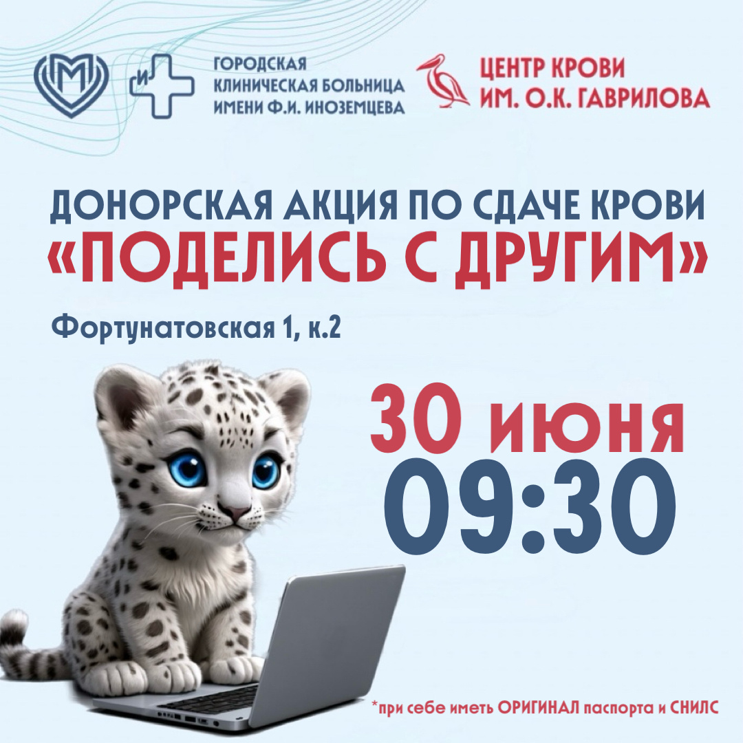 VIII донорская акция 30 июня в ГКБ им. Ф.И. Иноземцева!💙Приглашаем!
