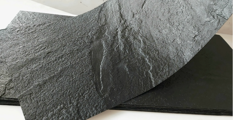 Шпон сланца обладает богатой текстурой и цветовой гаммой, варьирующейся от темно-серых и черных до зеленоватых и коричневых оттенков.