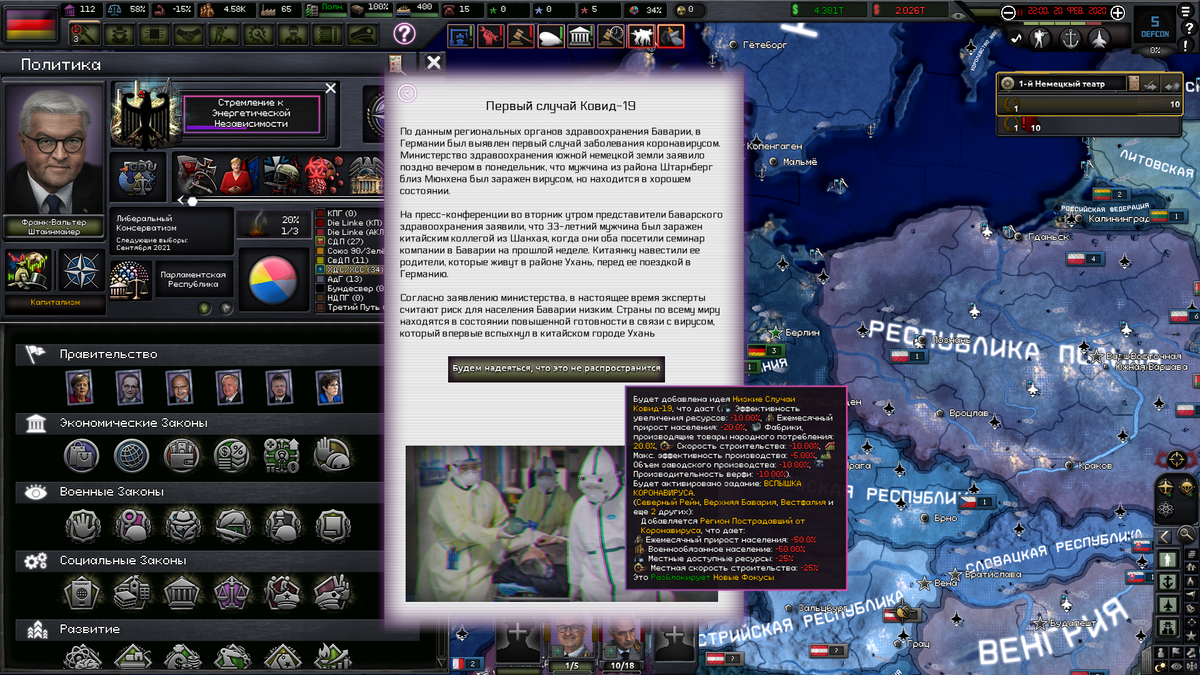 Здравия желаю, бовгары и гости Бовгарии! Сегодня мы с вами постараемся сделать из либеральной Германии, пресмыкающейся перед либералами и «зелёными», новую ГДР, но с небольшими нюансами. На начало нового 2020 года в Германии президентом является Франк-Вальтер Штайнмайер (который, к слову, всё ещё президентствует), а канцлером является Ангела Меркель от Христианско-Демократического Союза (и ныне это правящая партия). Большой армии иметь мы не можем из-за проделок с 1939 по 1945, так что военное производство и Бундесвер у нас хромают, зато есть прекрасная (на бумаге) экономика. В феврале случился первый случай заражения новым вирусом, но, благодаря слаженной работе наших политиков, мы быстро смогли полностью от него избавиться, даже раньше изобретения вакцины. На выборах в Америке победил самоходный дедушка Джо, но так как дедуля уже ни на что не годен, в Соединённых Штатах началась гражданская война. Для нас это открывает возможность завладеть всем оставшимся НАТО. После наплыва америк