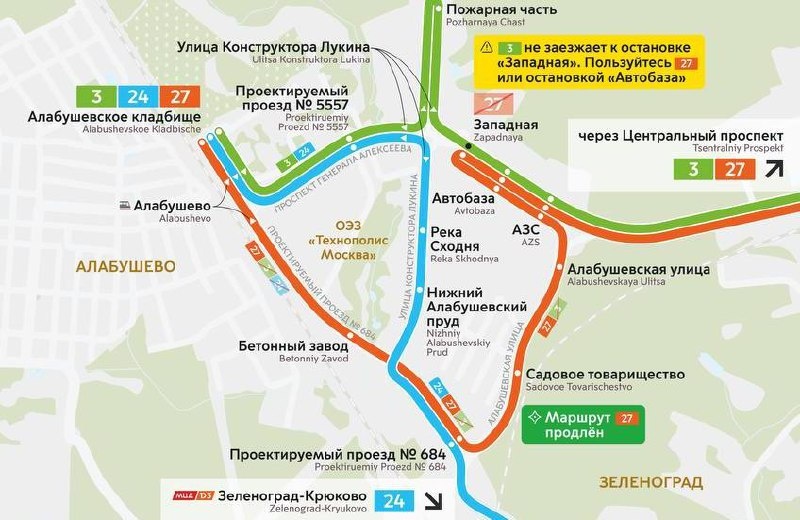 Меняется схема движения трёх зеленоградских автобусов в Западной промзоне. «Тройка» не будет ходить по Алабушевской улице, по ней пустят 27-й – до Алабушевского кладбища... Подробности на нашем сайте