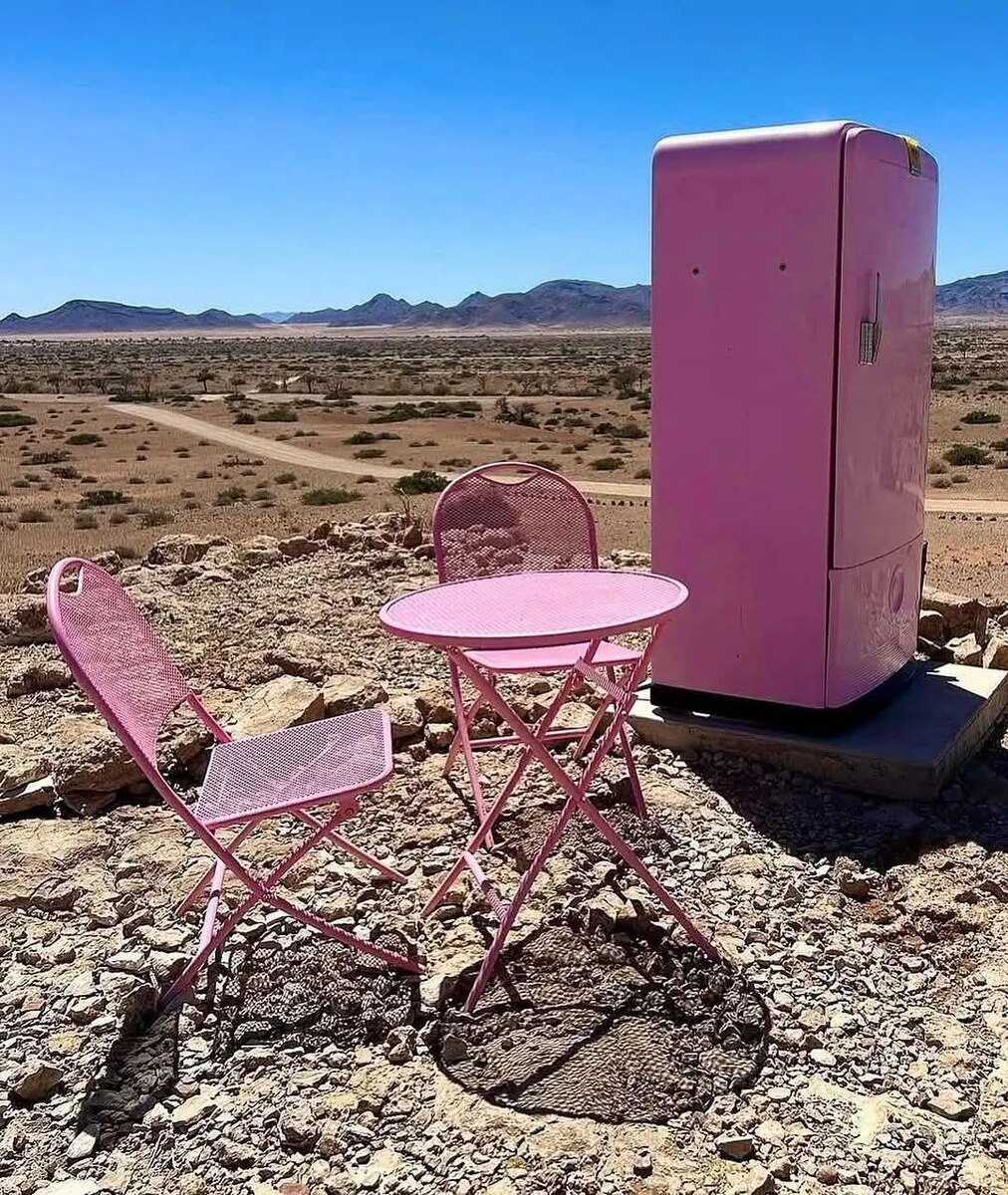 Среди пустынных пейзажей Намибии находится розовый холодильник, предназначенный для помощи путешественникам в борьбе с жарой. Холодильник работает на солнечной энергии и ежедневно пополняется водой и холодным чаем, которые можно брать бесплатно. Местоположение этого необычного оазиса можно найти по координатам.