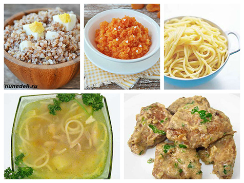 - Четверг: Гречка с чаем, макароны с морковью, курица с капустой.