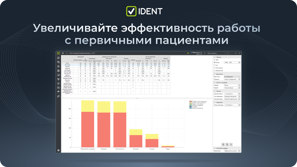 Делимся подробным руководством по анализу и оптимизации работы с первичными пациентами с помощью отчета «Конверсия администраторов» в IDENT. Он поможет выявить узкие места и повысить лояльность пациентов за счет улучшения их опыта на первом этапе взаимодействия с клиникой. А в нашем тг-канале мы подготовили для вас подробную видеоинструкцию, смотрите в этом посте😉 Первичное обращение — это первый шаг в воронке взаимодействия с пациентом. От того, насколько профессионально и эффективно ваши администраторы обрабатывают звонки и заявки, зависит, станет ли обратившийся вашим пациентом. 1️⃣ Конверсия из обращений в запись на прием. Это основная метрика, которая показывает, какой процент обращений (звонков, заявок через сайт или мессенджеры) превращается в записи на прием. Например, если из 100 звонков записалось только 20 пациентов, конверсия составляет 20%. ❗️ Низкая конверсия может указывать на недостаточную подготовку сотрудников или нехватку информации о ваших услугах. Как использовать