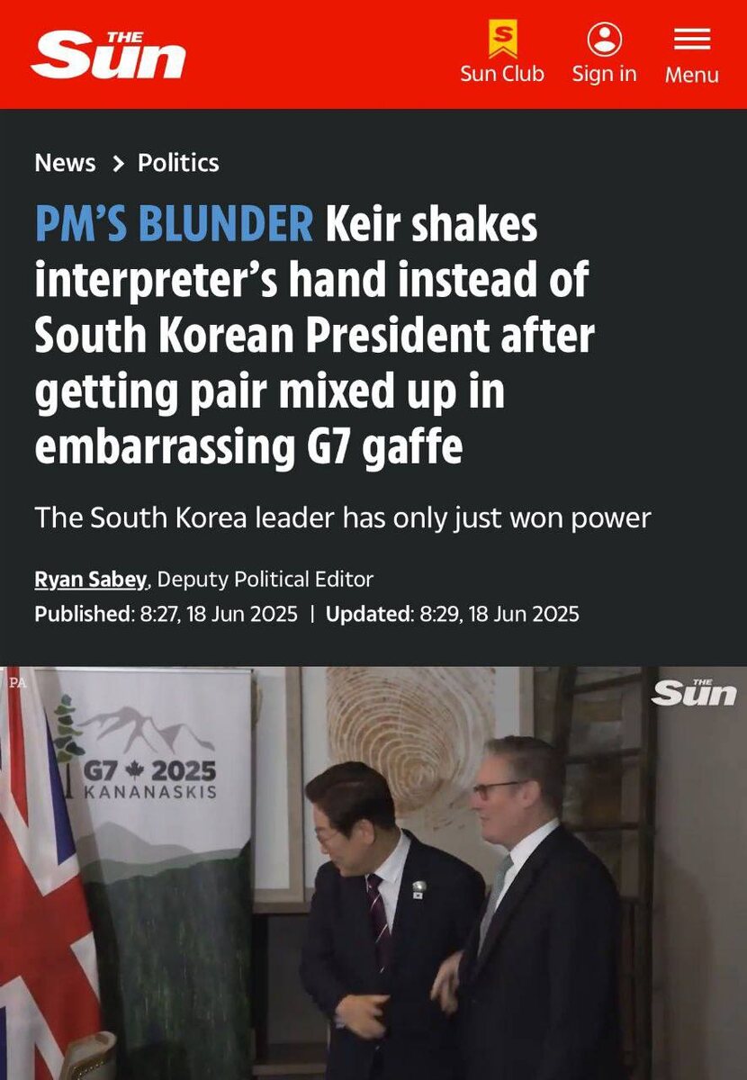 Британский премьер Кир Стармер опозорился на саммите G7, обменявшись рукопожатием с переводчиком нового президента Южной Кореи, а не с самим
